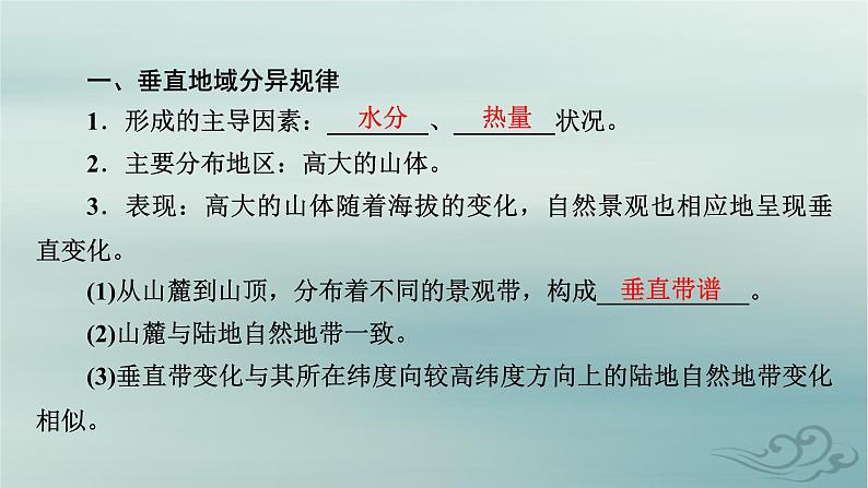 一、垂直地域分异规律1.形成的主导因素:________、________状况。2.主要分布地区:高大的山体。3.表现:高大的山体随着海拔的变化,自然景观也相应地呈现垂直变化。(1)从山麓到山顶,分布着不同的景观带,构成____________。(2)山麓与陆地自然地带一致。(3)垂直带变化与其所在纬度向较高纬度方向上的陆地自然地带变化相似。
