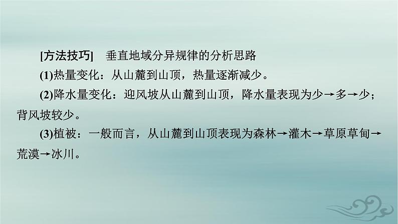 [方法技巧] 垂直地域分异规律的分析思路(1)热量变化:从山麓到山顶,热量逐渐减少。(2)降水量变化:迎风坡从山麓到山顶,降水量表现为少→多→少;背风坡较少。(3)植被:一般而言,从山麓到山顶表现为森林→灌木→草原草甸→荒漠→冰川。