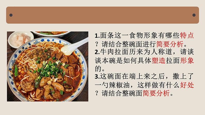 1.面条这一食物形象有哪些特点?请结合整碗面进行简要分析。2.牛肉拉面历来为人称道,请谈谈本碗是如何具体塑造拉面形象的。3.这碗面在端上来之后,撒上了一勺辣椒油,这样做有什么好处?请结合整碗面简要分析。