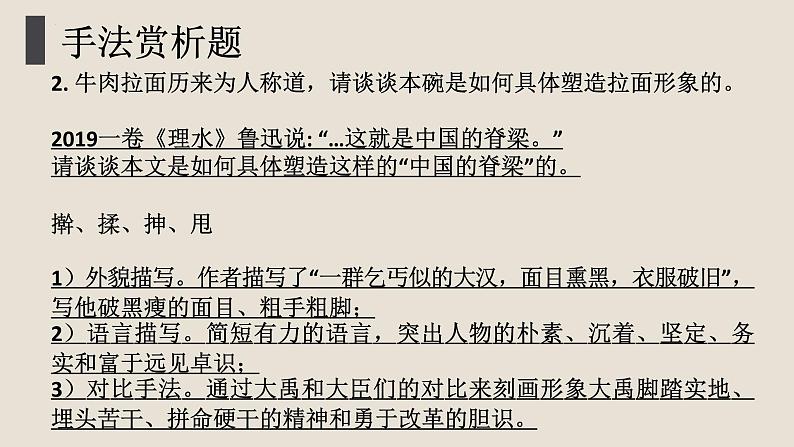 2. 牛肉拉面历来为人称道,请谈谈本碗是如何具体塑造拉面形象的。2019一卷《理水》鲁迅说: “…这就是中国的脊梁。”请谈谈本文是如何具体塑造这样的“中国的脊梁”的。擀、揉、抻、甩1)外貌描写。作者描写了“一群乞丐似的大汉,面目熏黑,衣服破旧”,写他破黑瘦的面目、粗手粗脚;2)语言描写。简短有力的语言,突出人物的朴素、沉着、坚定、务实和富于远见卓识;3)对比手法。通过大禹和大臣们的对比来刻画形象大禹脚踏实地、埋头苦干、拼命硬干的精神和勇于改革的胆识。