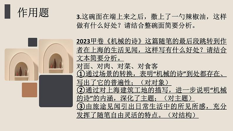 3.这碗面在端上来之后,撒上了一勺辣椒油,这样做有什么好处?请结合整碗面简要分析。2023甲卷《机械的诗》这篇随笔的最后段跳转到作者在上海的生活见闻,这样写有什么好处?请结合文本简要分析。对面、对肉、对菜、对食客①通过场景的转换,表明“机械的诗”到处都存在、写出了它的普遍性;(对对象)②通过对上海建筑工地的描写,进一步说明“机械的诗”的内涵,深化了主题;(对主题)③由旅途见闻引出日常生活中的所见所感,充分发挥了随笔自由灵活的特点。(对结构)
