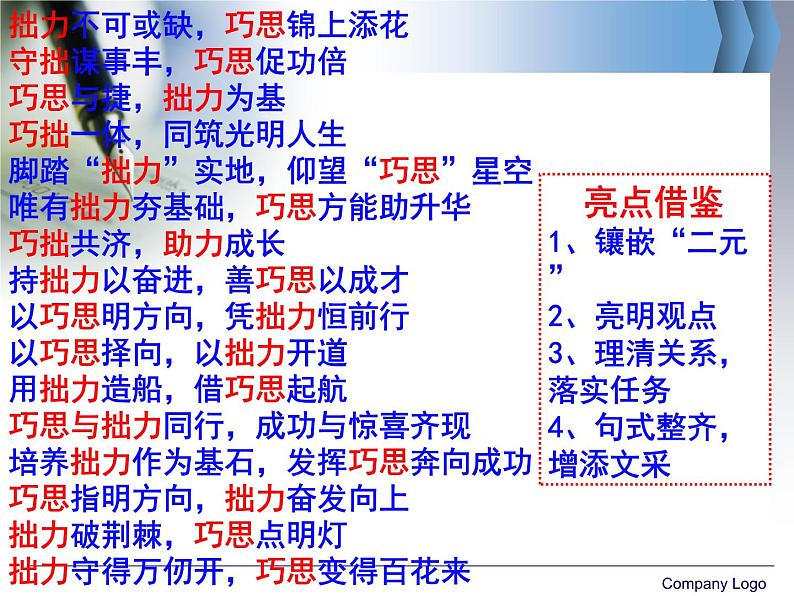 亮点借鉴1、镶嵌“二元”2、亮明观点3、理清关系, 落实任务4、句式整齐,增添文采
