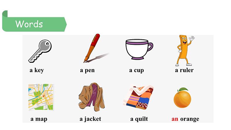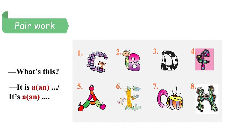 1. 复习字母A-H。2. 掌握表示物品的单词 掌握提问物品用英语怎么说的句型: —What's this in English? —It's a/an ... 3. 能够用单词和句型熟练对话。