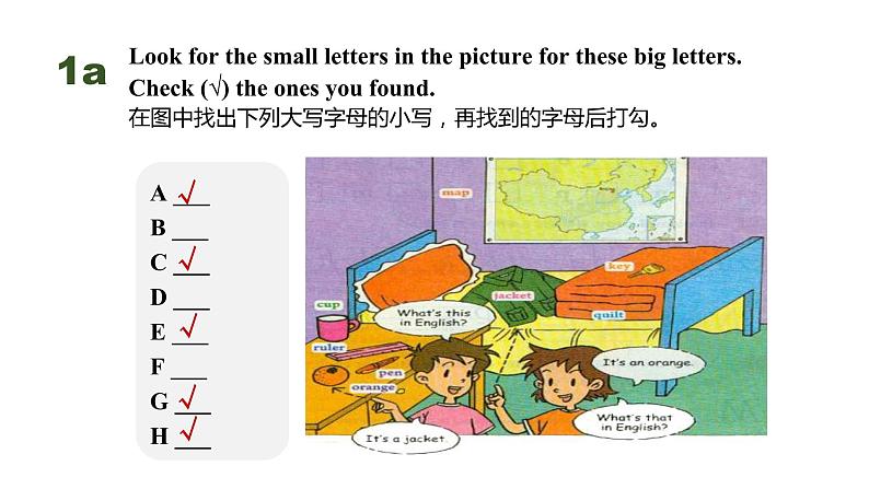 Lk fr the small letters in the picture fr these big letters. Check (√) the nes yu fund. 在图中找出下列大写字母的小写,再找到的字母后打勾。