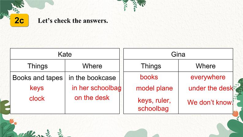 1. 短文中“ I ”是指Kate,因此“my”是指“凯特的”。2. 凯特的东西有三项;吉娜的东西列举了五项。 然后弄清它们的具体位置并完成表格。