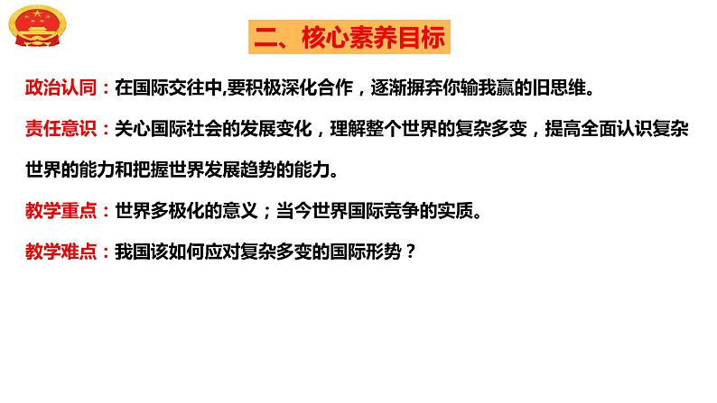 这是一份初中政治 (道德与法治)人教部编版九年级下册复杂多变的关系教学演示ppt课件,共22页。PPT课件主要包含了变化中的世界格局,热点聚焦,调整中的国家交往等内容,欢迎下载使用。
