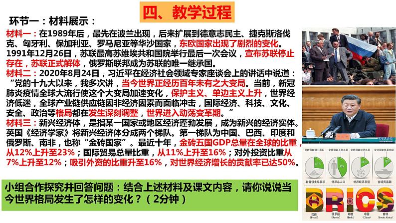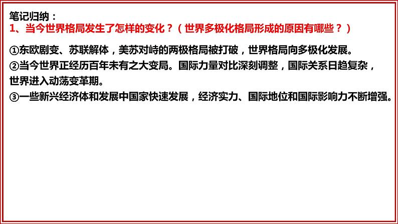 这是一份人教部编版九年级下册复杂多变的关系多媒体教学课件ppt,共19页。PPT课件主要包含了新课导入,核心素养目标,变化中的世界格局,环节一材料展示,教学过程,调整中的国家交往,环节二材料展示,笔记归纳,复杂多变的关系,调整中的国家关系等内容,欢迎下载使用。