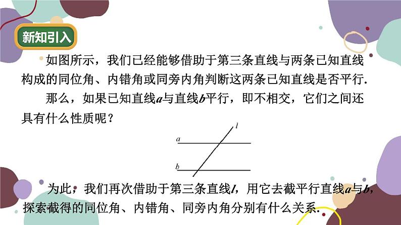 展开如图所示,我们已经能够借助于第三条直线与两条已知直线构成的同位角、内错角或同旁内角判断这两条已知直线是否平行. 那么,如果已知直线a与直线b平行,即不相交,它们之间还具有什么性质呢?