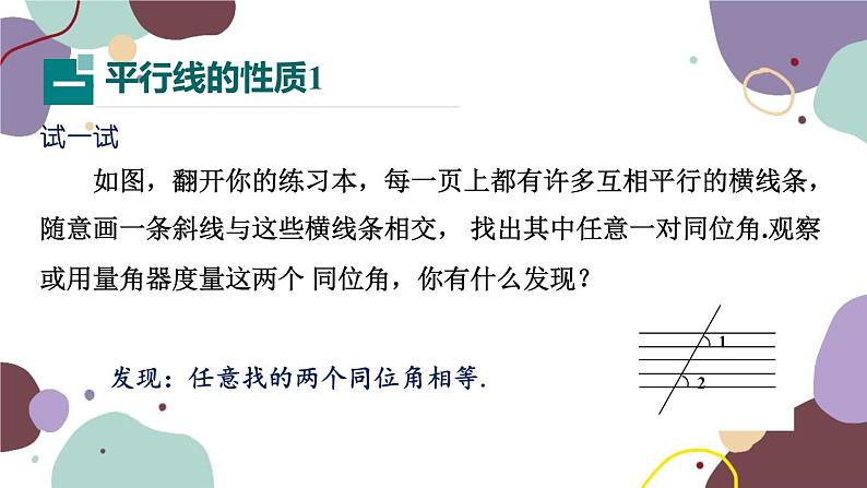试一试 如图,翻开你的练习本,每一页上都有许多互相平行的横线条,随意画一条斜线与这些横线条相交, 找出其中任意一对同位角.观察或用量角器度量这两个 同位角,你有什么发现?