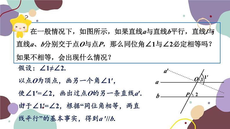 假设:∠1≠∠2.以点O为顶点,画另一个角∠1′,使∠1′=∠2,画出过点O的另一条直线a′.由于∠1′=∠2,根据“同位角相等,两直线平行”的基本事实,得到a ′//b.