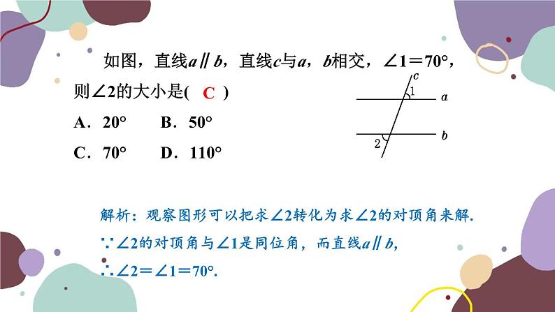 解析:观察图形可以把求∠2转化为求∠2的对顶角来解.∵∠2的对顶角与∠1是同位角,而直线a∥b,∴∠2=∠1=70°.
