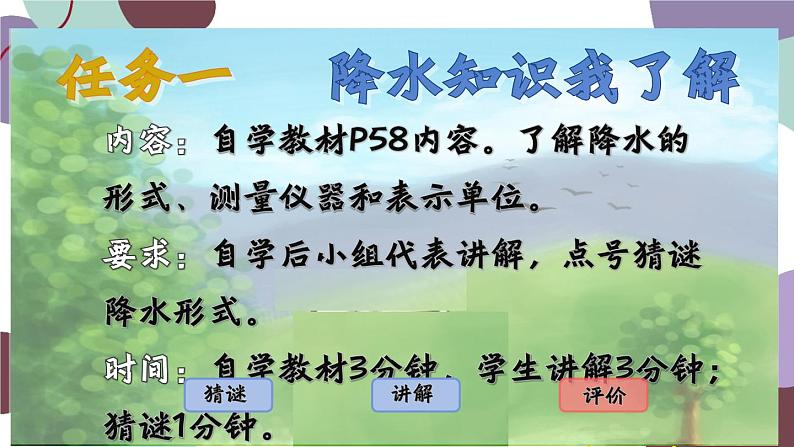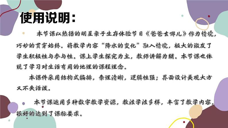 人教版七年级地理上册第三章 第三节第1课时 降水的变化教学课件使用说明: 本节课以热播的明星亲子生存体验节目《爸爸去哪儿》作为情境,巧妙的贯穿始终。将教学内容“降水的变化”融入情境,极大的激发了学生积极性与参与性。课上学生探究为主,教师讲解为辅。本节课也体现了学习对生活有用的地理的课程理念。 本课件采用结构式编排,条理清晰,逻辑性强;界面设计美观大方又不失活泼。 本节课运用多种数字教学资源,教法学法多样,丰富了教学内容,很好的达到了课标要求。学习目标①知道降水的形式、测量仪器和表示单位。②会使用降水资料,绘制降水量柱状图,并能用降水量柱状图说明降水的季节变化差异。③学会读图、绘图、析图。这次,爸爸和孩子们又有新任务啦!出发前,村长给大家发了张任务卡,你能帮忙完成吗?任务一 降水知识我了解内容:自学教材P58内容。了解降水的形式、测量仪器和表示单位。要求:自学后小组代表讲解,点号猜谜降水形式。时间:自学教材3分钟,学生讲解3分钟;猜谜1分钟。千条线,万条线,掉在水中都不见。 猜一自然现象大小豆粒从天撒,人畜庄稼都怕它, 尽干坏事伤天理,掌握科技征服它。 猜一自然现象小小白花天上栽,一夜北风花盛开。千变万化六个瓣,飘呀飘呀落下来。 猜一自然现象从大气中降落的雨、雪、冰雹等,统称为_______。降水降雨是降水的主要形式。降雨雾、霜、露水属不属于降水?一般每天在8时和20时各记录一次,这两次记录的降水量之和就是这一天的日降水量。测量降水量的基本仪器是雨量器,单位是:_______。雨量器毫米 降水的形式、降水量的多少与人们的生产、生活有什么关系?人类的活动能否影响降水呢?降水过多风调雨顺江南水乡的砖墙斜顶屋吐鲁番晾制葡萄干的晾房新疆北部雪灾南方水灾降水过多、过少都会造成一定的灾害。甘肃舟曲山洪泥石流人工消雹排放温室气体,导致气候变化,降水异常。人工增雨 降水的形式、降水量的多少与人们的生产、生活有什么关系?人类的活动能否影响降水呢? 降水影响人类的农业、工业、商业、交通,以及衣、食、住、行、游等活动。降水过多、过少都会造成一定的灾害。人类可以在一等程度上影响降水。 讲解满分5分,组间互评;猜谜正确者+1分。这次任务,5位爸爸和孩子们要分头行动去不同的地方,他们又遇到了哪些麻烦事呢?请看视频……亲爱的同学们,你能帮助5位爸爸和孩子们解释他们的提出的疑惑吗?任务二 答疑解惑我探究内容:根据各地降水资料,绘制降水量柱状图,解答父子疑惑。方法:组内合作完成降水量柱状图贴图及报告单,各组将贴图成果及目的地年降水量展示到黑板相应位置,并派代表讲解制图方法,解答父子疑惑。时间:贴图8分钟,讲解展示10分钟。月降水量、年降水量把一月内每日的降水量相加即为月降水量。通常所说的年降水量,是指多年平均降水量。把一年内每月的降水量相加即得到年降水量。 必备物品:1. “旅途疑惑”备忘录2. 目的地降水量资料3. 调查报告单第1步:运用降水量数据,绘制各月降水量柱状图,并计算年降水量。出发地——石家庄绘图方法:在坐标轴的相应位置,逐月标出降水量的高度,画出各月降水量柱状图。10毫米5毫米22毫米47毫米方法示范:年降水量:各月降水量之和石家庄市年降水量:745毫米出发地——石家庄石家庄745毫米不均匀夏季第2步:填写调查报告冬季石家庄市夏季降水多,冬季降水少,年降水量较多,适合树木生长,因此沿途经过小树林。Angela父女组 目的地——新疆目的地降水量资料新疆120毫米均匀新疆大部分地区年降水量在200毫米以下,降水少,植被稀少。目的地降水量资料广西桂林1240毫米均匀广西桂林年降水量在800毫米以上,降水多,气候湿润。石头父子组 目的地——广西桂林夏季冬季目的地降水量资料撒哈拉沙漠某地55毫米均匀撒哈拉沙漠大部分地区年降水量在50毫米左右,降水稀少。Kimi父子组 目的地——非洲撒哈拉沙漠目的地降水量资料亚马孙平原某地2915毫米均匀亚马孙平原年降水量在2000毫米以上,降水充沛,植物终年茂盛。天天父子组 目的地——南美洲亚马孙平原目的地降水量资料南极洲某地130毫米均匀南极地区年降水量在200毫米以下,降水稀少。Cindy父女组 目的地——南极洲 贴图正确,小组+2分;讲解满分5分,组间互评。任务三 对比分析我提升内容:对比石家庄和亚马孙平原某地的年降水量:1.两地降水的季节分配是否均匀?2.若不均匀哪个季节降水多,哪个季节降水少?要求:独立思考,仔细读图,对比差异,总结特征。时间:3分钟后点号回答。 石家庄夏季降水多,冬季降水少,降水的季节分配不均匀。 亚马孙平原某地全年多雨,降水的季节分配均匀。降水量柱状图的判读方法看“极值”,对“月份”即看降水量最大值、最小值,及其出现的月份。算“差值”,说“变化”即计算降水量最大值与最小值的差,描述该地降水量的季节变化大小。2.看“差值”,说“变化”1.看“总量”,说“多少”即观察、估算年降水总量,对该地年降水量进 行定性描述为“多”、“较多”、“较少”或“少”。夏季多雨型冬季多雨型全年湿润型全年少雨型全年多雨型下图各地降水的季节变化有什么特点? 回答正确+1分。 同学们,通过今天的探究相信你一定收获颇丰!那么就让我们一起迎接最后一个挑战,检