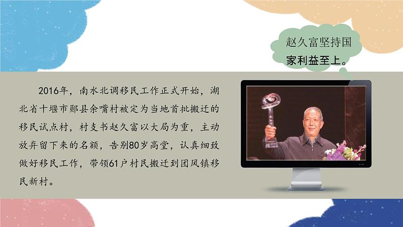 展开政治 (道德与法治)八年级上册坚持国家利益至上图片ppt课件: 这是一份政治 (道德与法治)八年级上册坚持国家利益至上图片ppt课件,共16页。PPT课件主要包含了时政导入,研学问题探究1,研学问题探究2,不正确,研学问题探究3,研学问题探究4,人民英雄张定宇等内容,欢迎下载使用。