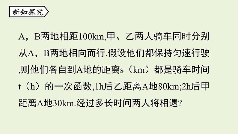 A,B两地相距100km,甲、乙两人骑车同时分别从A,B两地相向而行.假设他们都保持匀速行驶,则他们各自到A地的距离s(km)都是骑车时间t(h)的一次函数,1h后乙距离A地80km;2h后甲距离A地30km.经过多长时间两人将相遇?