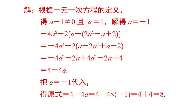 人教版七年级(上)第三章 一元一次方程综合专题讲解专题目录专题一:方程中与字母系数有关的问题专题二:一元一次方程的应用专题一:方程中与字母系数有关的问题类型一:利用方程定义求字母参数例1 已知关于 x 的方程 ax-1=x 为一元一次方程,则 |a-1| 的值一定为 ( )A.正数 B.非负数C.零 D.不能确定A判断方程是否为一元一次方程:③ 等号两边都是整式.② 未知数的次数是 1;① 只含有一个未知数;1.已知关于 x 的方程 (m2-4)x2-(m+2)x-3=0 是一元一次方程,则 m=_______·22.(武汉武昌区期末)若 (a-1)x|a|-3=0 是关于 x 的一元一次方程,求 -4a²-2[a-(2a2-a+2)] 的值.解:根据一元一次方程的定义,得原式=4-4a=4-4×(-1)=4+4=8.把 a=-1代入,=4-4a.=-4a2-2a+4a2-2a+4=-4a²-2(a-2a2+a-2)-4a²-2[a-(2a²-a+2)]得 a-1≠0 且 |a|=1,解得 a=-1.类型二:利用方程的解求字母参数例2 若关于 x 的方程 2x-(2a-1)x+3=0 的解是 x=3,则 a= ( )A. 1 B. 0 C. 2 D.3CD例3 已知关于 x 的方程 5x+3k=21 与 5x+3=0 的解相同,则 k 的值是 ( )A.-10 B.7 C. -9 D. 8解:(1) 将第二个方程去括号,得 5x-5-1=4x-4+1解得 x=3.(2) 将 x=3+2=5 代入第一个方程得解得 m=22.类型三:求含字母参数的方程的解例4 (汉阳区期末)已知关于 x 的一元一次方程 x+1=2x+a 的解为 x=-1,那么关于 y 的一元一次方程 (y+2)+1=2(y+2)+a 的解是 ( ) A. y =-1 B. y =1 C. y =-3 D. y =3C4.已知 |n+2|+(5m-3)2=0,求关于 x 的方程 10mx+4=3x+n 的解.解:由 |n+2|+(5m-3)2=0 得n+2=0 ,5m-3=0.将 m、n 的值代入方程得6x+4=3x-2.故关于 x 的方程的解是 x=-2. 专题二:一元一次方程的应用类型一:行程问题ABC甲乙路程=速度×时间①相遇问题:s甲+s乙=s总v甲t甲+v甲t甲=s总②追及问题:s甲-s乙=s差(v甲-v乙)t追=s差例1 (甘肃)《九章算术》中记载了一道数学问题,其译文为:今有野鸭从南海起飞,7 天到北海;大雁从北海起飞,9 天到南海,现野鸭从南海、大雁从北海同时起飞,问经过多少天相遇 ? 设经过 x 天相遇,根据题意可列方程为 ( )A例2 (连云港)元朝朱世杰所著的《算学启蒙》中,记载了这样一道题:良马日行二百四十里,驽马日行一百五十里,驽马先行一十一日,问良马几何日追及之?其大意是:快马每天行 240 里,慢马每天行 150 里,慢马先行 12 天,快马几天可追上慢马?若设快马 x 天可追上慢马,由题意得 ( ) C.240(x-12)=150x D D.240x=150(x+12)例3 (荔湾区期末)爸爸与小明在足球场上进行耐力训练,他们在 400 米的环形跑道上从同一起点沿同一方向同时出发进行绕圈跑,爸爸跑完一圈时,小明才跑完半圈,4 分钟时爸爸第一次追上小明.请问:(1) 小明与爸爸的速度各是多少?(2) 再过多少分钟后,爸爸在第二次追上小明前两人相距50 米?(1)如右图所示,分析:s爸爸-s小明=跑道长度解:(1) 设小明的速度为 x 米/分钟,则爸爸的速度为 2x 米/分钟,答:小明的速度为 100 米/分,爸爸的速度为 200 米/分.则 2x=200.解得:x=100,根据题意得 4(2x-x)=400,(2)第二次相遇前:分析:① s爸爸-s小明=50.② s爸爸-s小明=350.(2) 设再经过 y 分钟后,爸爸在第二次追上小明前两人相距 50 米.①爸爸第一次追上小明后,在第二次相遇前,爸爸又比小明多跑了50 米,根据题意得 200y-100y=50,解得 y=0.5.答:再过 0.5 或 3.5 分钟后,爸爸在第二次追上小明前两人相距 50 米.②爸爸第一次追上小明后,在第二次相遇前,爸爸又比小明多跑了 350 米.根据题意得 200y-100y=350,解得 y=3.5.例4 为推进我国“碳达峰、碳中和”双碳目标的实现,各地大力推广分布式光伏发电项目.某公司计划建设一座光伏发电站,若由甲工程队单独施工需要 3 周,每周耗资 8 万元,若由乙工程队单独施工需要 6 周,每周耗资 3 万元.(1) 若甲、乙两工程队合作施工,需要几周完成?共耗资多少万元?(2) 若需要最迟 4 周完成工程,请你设计一种方案,既要保证按时完成任务,又要最大限度节省资金并求出该种方案需要耗资多少万元.(时间按整周计算)类型二:工程问题解:(1)设甲、乙两工程队合作施工,需要 x 周完成.根据题意,得解得 x=2. 所以 (8+3)×2=22 (万元). 答:甲、乙两工程队合作施工,需要 2 周完成,共耗资 22 万元.(2) 设先由甲、乙两工程队合作施工 y 周,剩下的由乙单独完成.根据题意,得解得 y =1.所以 4-1=3.所以 (8+3)×1+3×3=20(万元).答:先由甲和乙两工程队合作施工 1 周,剩下的由乙单独施工 3 周最节省资金.例5 (吉林)《九章算术》中记载了一道数学问题,其译文为:有人合伙买羊,每人出 5 钱,还缺 45 钱;每人出 7 钱,还缺 3 钱,问合伙人数是多少?为解决此问题,设合伙人数为 x 人,可列方程为_________________.5x+45=7x+3 类型三:盈亏问题(补充)1.(南充)《孙子算经》记载:“今有木,不知长短,引绳度之,余绳四尺五寸;屈绳量之,不足一尺,木长几何?”(尺、寸是长度单位,1尺=10寸).意思是,现有一根长木,不知道其长短,用一根绳子去度量长木,绳子还剩余 4.5 尺;将绳子对折再度量长木,长木还剩余 1 尺.问长木长多少?设长木长为 x 尺,则可列方程为 ( )A例6 国家速滑馆“冰丝带”,是某年北京会北京赛区标志性、唯一新建的冰上竞赛场馆.某大学冬奥志愿者负责本场馆的对外联络和文化展示服务工作,负责对外联络服务工作的有 17 人,负责文化展示服务工作的有 10 人,现在另调 20 人去两服务处支援,使得在对外联络服务工作的人数比在文化展示服务的人数的 2 倍多 5 人,问应调往对外联络、文化展示两服务处各多少人?类型四:调配、配套问题(补充)答:应调往对外联络服务处 16 人,文化展示服务处 4 人.解:设应调往对外联络服务