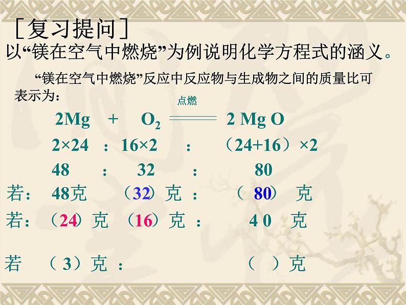 [复习提问]以“镁在空气中燃烧”为例说明化学方程式的涵义。