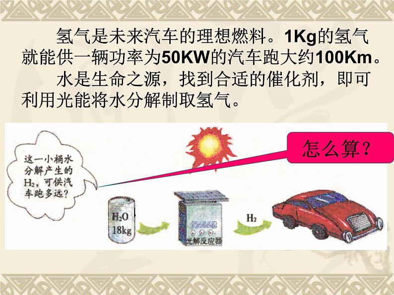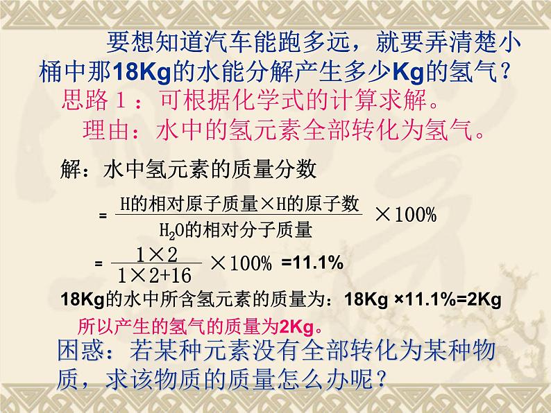要想知道汽车能跑多远,就要弄清楚小桶中那18Kg的水能分解产生多少Kg的氢气?