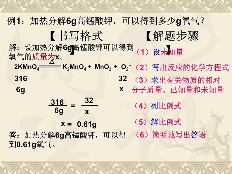 例1:加热分解6g高锰酸钾,可以得到多少g氧气?