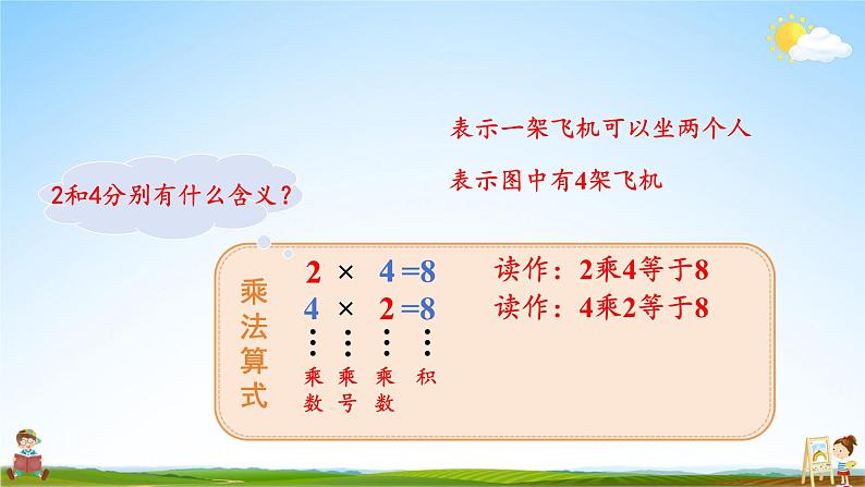 这是一份北师大版儿童乐园课文配套ppt课件,共13页。PPT课件主要包含了有多少人坐小飞机,答有8人坐小飞机,---乘数,---积,认一认,---乘号,有多少人坐小火车,×624人,+714个,填一填算一算等内容,欢迎下载使用。