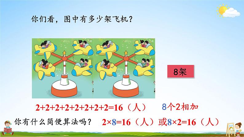 加法改乘法的方法:几个几相加,可以写成几乘几。 相同加数×相同加数的个数