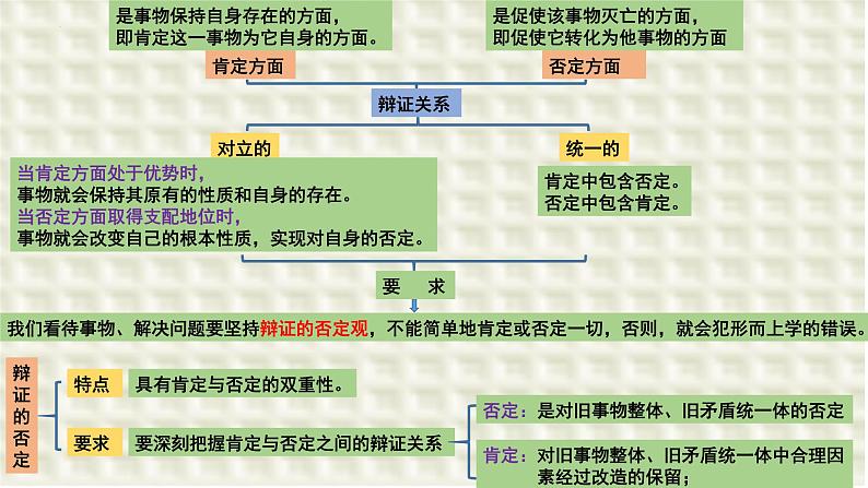 肯定:对旧事物整体、旧矛盾统一体中合理因 素经过改造的保留;