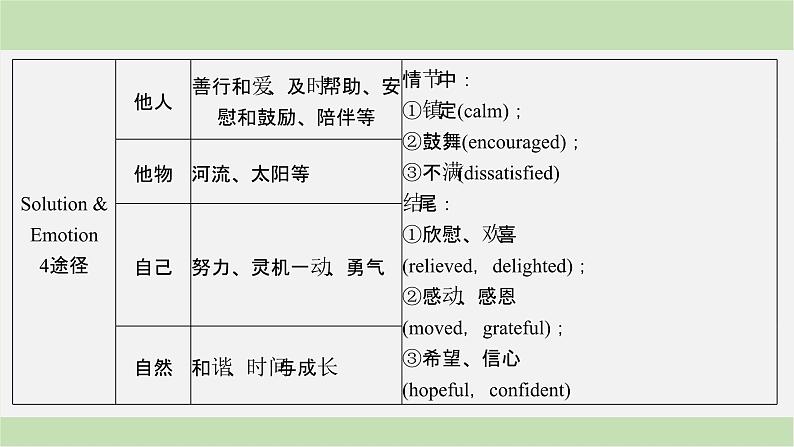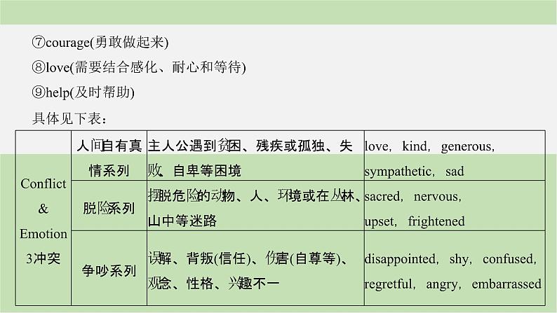 读后续写的续写内容从命题角度来看都会围绕“Cnflict & Slutin”展开。结合历年考查的题材来看,题材主要关于:人间自有真情系列、迷路系列、脱险系列、争吵系列。解决方案基本是以下途径:①encuragement(某人的鼓励)②cmfrt(某人的安慰)③inspiratin(突然灵机一动)④effrt(自己的努力训练)⑤calm(冷静思考)⑥kindness(某人的善行)
