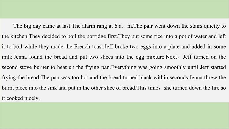 The big day came at last.The alarm rang at 6 a.m.The pair went dwn the stairs quietly t the kitchen.They decided t bil the prridge first.They put sme rice int a pt f water and left it t bil while they made the French tast.Jeff brke tw eggs int a plate and added in sme milk.Jenna fund the bread and put tw slices int the egg mixture.Next,Jeff turned n the secnd stve burner t heat up the frying pan.Everything was ging smthly until Jeff started frying the bread.The pan was t ht and the bread turned black within secnds.Jenna threw the burnt piece int the sink and put in the ther slice f bread.This time,she turned dwn the fire s it cked nicely.