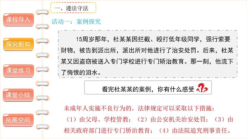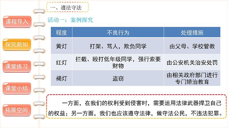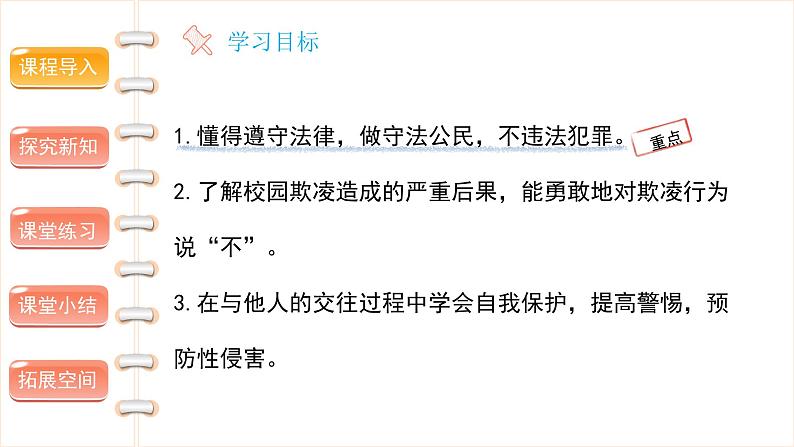 1.懂得遵守法律,做守法公民,不违法犯罪。2.了解校园欺凌造成的严重后果,能勇敢地对欺凌行为说“不”。3.在与他人的交往过程中学会自我保护,提高警惕,预防性侵害。