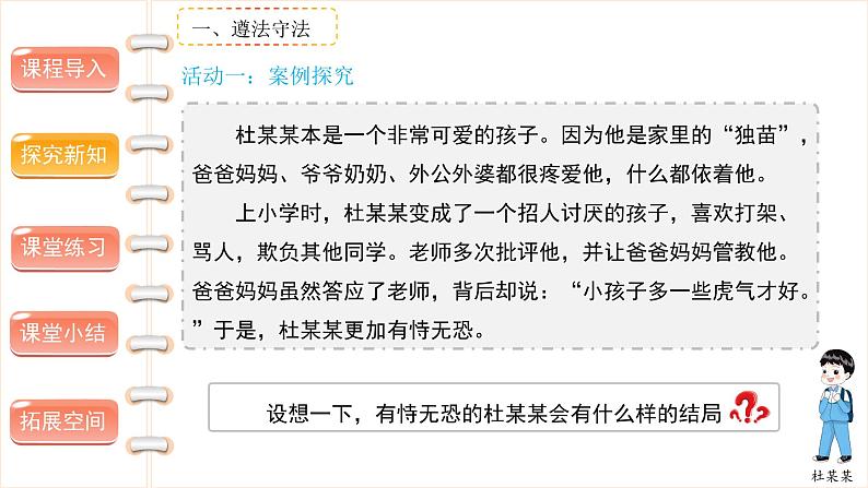 杜某某本是一个非常可爱的孩子。因为他是家里的“独苗”,爸爸妈妈、爷爷奶奶、外公外婆都很疼爱他,什么都依着他。 上小学时,杜某某变成了一个招人讨厌的孩子,喜欢打架、骂人,欺负其他同学。老师多次批评他,并让爸爸妈妈管教他。爸爸妈妈虽然答应了老师,背后却说:“小孩子多一些虎气才好。”于是,杜某某更加有恃无恐。