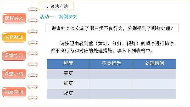 请按照由轻到重(黄灯、红灯、褐灯)的顺序进行排序,将不良行为和对应的处理措施,填入下列表格中。