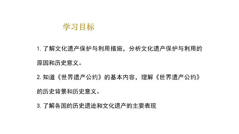 展开1.了解文化遗产保护与利用措施,分析文化遗产保护与利用的原因和历史意义。2.知道《世界遗产公约》的基本内容,理解《世界遗产公约》的历史背景和历史意义。3.了解各国的历史遗迹和文化遗产的主要表现
