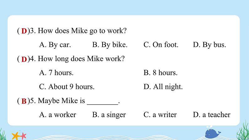 ( )3. Hw des Mike g t wrk? A. By car. B. By bike. C. On ft. D. By bus.( )4. Hw lng des Mike wrk? A. 7 hurs. B. 8 hurs. C. Abut 9 hurs. D. All night.( )5. Maybe Mike is ________. A. a wrker B. a singer C. a writer D. a teacher