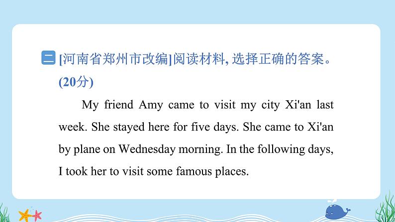 [河南省郑州市改编]阅读材料, 选择正确的答案。(20分) My friend Amy came t visit my city Xi'an last week. She stayed here fr five days. She came t Xi'an by plane n Wednesday mrning. In the fllwing days, I tk her t visit sme famus places.