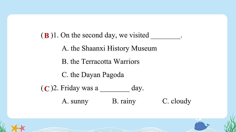 ( )1. On the secnd day, we visited ________. A. the Shaanxi Histry Museum B. the Terractta Warrirs C. the Dayan Pagda ( )2. Friday was a ________ day. A. sunny B. rainy C. cludy