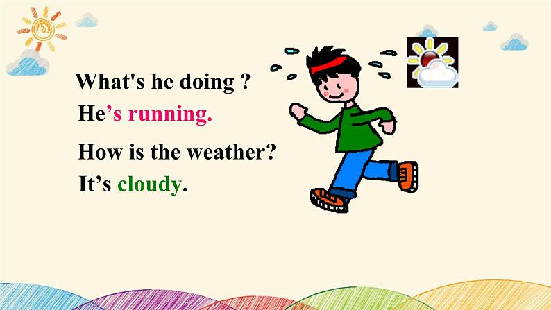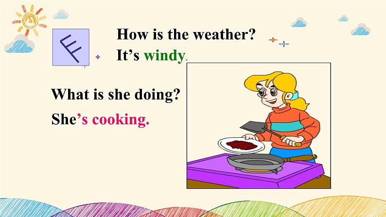 —天气怎么样? —_____________________ —天气多云。/天气晴朗。/天在下雨。 ________________________________2. —你在做什么?_________________ —我在做饭。______________