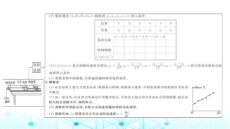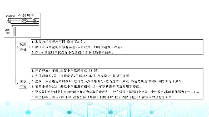 1.图甲(图中长木板水平固定)是高中物理常用的力学实验装置,现用该装置完成“探究小车速度随时间变化的规律”。(1)图乙中的实验照片是否有实验错误、不合理或不必要之处?若存在问题,请指明问题所在。_______________________________________________________。[解析] 照片A:实验有错误之处,选用蓄电池作为电源。照片B:实验有不合理之处,小车起始点离打点计时器过远。
