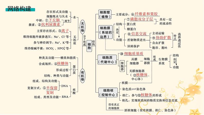 这是一份适用于新高考新教材2024版高考生物二轮复习专题1细胞的分子组成结构与物质运输课件,共60页。PPT课件主要包含了落实主干知识,下丘脑,抗利尿激素,核糖体,半保留复制,纤维素和果胶,磷脂双分子层,信息交流,协助扩散,细胞质基质等内容,欢迎下载使用。