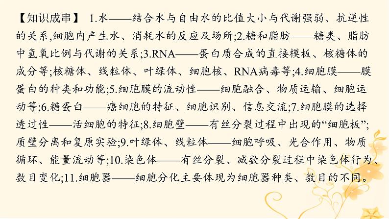 【知识成串】 1.水——结合水与自由水的比值大小与代谢强弱、抗逆性的关系,细胞内产生水、消耗水的反应及场所;2.糖和脂肪——糖类、脂肪中氢氧比例与代谢的关系;3.RNA——蛋白质合成的直接模板、核糖体的成分等;核糖体、线粒体、叶绿体、细胞核、RNA病毒等;4.细胞膜——膜蛋白的种类和功能;5.细胞膜的流动性——细胞融合、物质运输、细胞运动等;6.糖蛋白——癌细胞的特征、细胞识别、信息交流;7.细胞膜的选择透过性——活细胞的特征;8.细胞壁——有丝分裂过程中出现的“细胞板”;质壁分离和复原实验;9.叶绿体、线粒体——细胞呼吸、光合作用、物质循环、能量流动等;10.染色体——有丝分裂、减数分裂过程中染色体行为、数目变化;11.细胞器——细胞分化主要体现为细胞器种类、数目的不同。