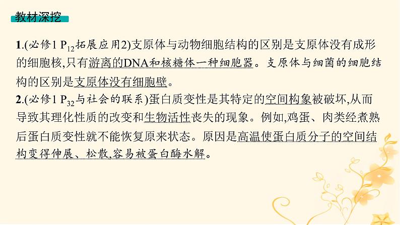1.(必修1 P12拓展应用2)支原体与动物细胞结构的区别是支原体没有成形的细胞核,只有游离的DNA和核糖体一种细胞器。支原体与细菌的细胞结构的区别是支原体没有细胞壁。2.(必修1 P32与社会的联系)蛋白质变性是其特定的空间构象被破坏,从而导致其理化性质的改变和生物活性丧失的现象。例如,鸡蛋、肉类经煮熟后蛋白质变性就不能恢复原来状态。原因是高温使蛋白质分子的空间结构变得伸展、松散,容易被蛋白酶水解。