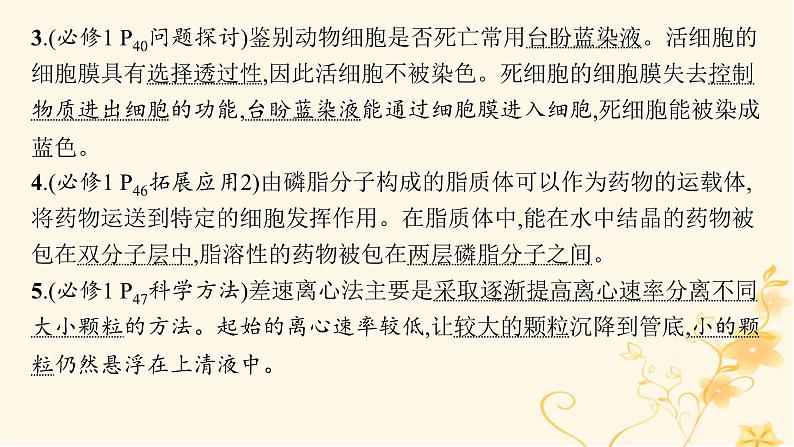3.(必修1 P40问题探讨)鉴别动物细胞是否死亡常用台盼蓝染液。活细胞的细胞膜具有选择透过性,因此活细胞不被染色。死细胞的细胞膜失去控制物质进出细胞的功能,台盼蓝染液能通过细胞膜进入细胞,死细胞能被染成蓝色。4.(必修1 P46拓展应用2)由磷脂分子构成的脂质体可以作为药物的运载体,将药物运送到特定的细胞发挥作用。在脂质体中,能在水中结晶的药物被包在双分子层中,脂溶性的药物被包在两层磷脂分子之间。5.(必修1 P47科学方法)差速离心法主要是采取逐渐提高离心速率分离不同大小颗粒的方法。起始的离心速率较低,让较大的颗粒沉降到管底,小的颗粒仍然悬浮在上清液中。