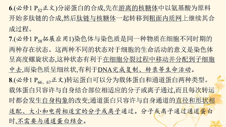 6.(必修1 P52正文)分泌蛋白的合成,先在游离的核糖体中以氨基酸为原料开始多肽链的合成,然后肽链与核糖体一起转移到粗面内质网上继续其合成过程。7.(必修1 P58拓展应用1)染色体与染色质是同一种物质在细胞不同时期的两种存在状态。这两种不同的状态对于细胞的生命活动的意义是染色体呈高度螺旋状态,这种状态有利于在细胞分裂过程中移动并分配到子细胞中去,而染色质呈细丝状,有利于DNA完成复制、转录等生命活动。8.(必修1 P66、67正文)转运蛋白可以分为载体蛋白和通道蛋白两种类型。载体蛋白只容许与自身结合部位相适应的分子或离子通过,而且每次转运时都会发生自身构象的改变;通道蛋白只容许与自身通道的直径和形状相适配、大小和电荷相适宜的分子或离子通过。分子或离子通过通道蛋白时,不需要与通道蛋白结合。