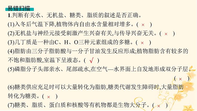 1.判断有关水、无机盐、糖类、脂质的叙述是否正确。(1)入冬后气温下降,植物体内自由水含量相对增多。( )(2)无机盐与神经元接受刺激产生兴奋有关,与传导兴奋无关。( )(3)几丁质是一种由C、H、O三种元素组成的多糖。( )(4)脂肪由三分子脂肪酸与一分子甘油发生反应形成;植物脂肪含有较多的不饱和脂肪酸,室温下呈液态。( )(5)磷脂分子头部亲水、尾部疏水,在空气—水界面上自发地形成双分子层。( )(6)糖类供应充足时可以大量转化为脂肪,糖类代谢发生障碍时,大量脂肪转化为糖类。( )(7)糖类、脂质、蛋白质和核酸等有机物都是生物大分子。( )