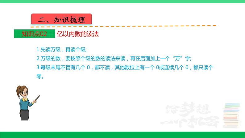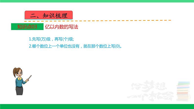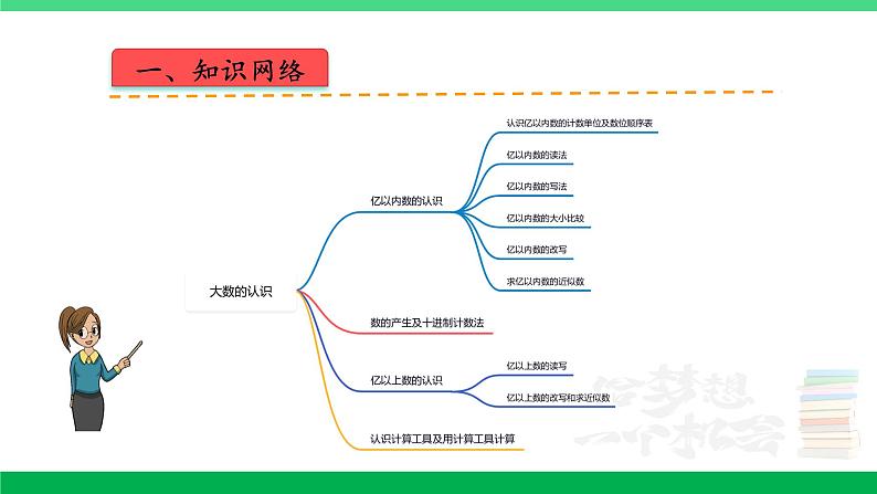 第一单元 大数的认识四年级上册 人教版一、知识网络二、知识梳理1.个(一)、十、百、千、万......亿都是计数单位。2.每相邻两个计数单位之间的进率是 10。3.计数单位所占的位置是数位,哪一位上是几,就表示有几个这样的计数单位。4.从个位向左起,每四个数位是一级,分别是个级、万级、亿级。二、知识梳理1.先读万级,再读个级;2.万级的数,要按照个级的数的读法来读,再在后面加上一个“万”字;3.每级末尾不管有几个 0,都不读,其他数位上有一个 0或连续几个 0,都只读个零。二、知识梳理1.先写(万)级,再写(个)级;2.哪个数位上一个单位也没有,就在那个数位上写(0)。二、知识梳理1.位数不同的两个数,位数多的那个数就大。2.位数相同的两个数,从最高位比起,最高位上的数大的那个数就大;如果最高位上的数相同,就比较下一个数位上的数······直到比较出大小为止。二、知识梳理把整万的数改写成用“万”作单位的数,就是把个级的 4个0 去掉,写上一个“万”字。二、知识梳理求亿以内数的近似数的方法: 求一个数的近似数,要看省略的尾数部分的最高位上的数是小于 5 还是等于或大于 5。如果省略的尾数部分的最高位上的数小于 5,就把尾数舍去,然后添上相应的单位;如果省略的尾数部分的最高位上的数是 5或大于 5,就向它的前一位进 1,再把尾数舍去,然后添上相应的单位。二、知识梳理1.用来表示物体个数的 1,2,3,4,5,···都是自然数。2.最小的自然数是 0,没有最大的自然数,自然数的个数是无限的。3.每相邻两个计数单位之间的进率都是十的计数方法叫作十进制计数法。二、知识梳理(一)亿以上数的读法:1.先分级,从高位读起,一级一级往下读。2.读亿级或万级的数,先按照个级的读法读,再在后面加上一个“亿”字或“万”字。3.每级末尾的0都不读,每级中间有一个0或连续几个0,都只读一个零。(二)亿以上数的写法:1.先找“亿”和“万”字分级;2.从高位写起,先写亿级,再写万级,最后写个级;3.哪个数位上一个单位也没有,就用 0 占位。二、知识梳理(一)亿以上数的改写方法:找到亿位,去掉亿位后面的8个0,换成“亿”字,用“=”连接。(二)省略亿位后面的尾数求近似数的方法:1.先分级,找到亿位。2.根据千万位上的数字进行“四舍五人”,舍去尾数,再加上“亿”字。3.用“≈”连接。二、知识梳理1.算盘的用法:一颗下珠表示 1,一颗上珠表示 5,用空档表示 0。2.用计算器计算时,先按开机键,再按数字键输入第一个数,然后按运算符号键接着按数字键输入第二个数,最后按等号键得出结果。三、精讲精练分析典例01根据整数中“零”的读法,每一级末尾的0都不读出来,其余数位连续几个0都只读一个零,要想一个“零”也不读,就要把所有的0都写在每级的末尾;要想只读一个“零”,就要有一个0或连续几个0不能写在每级的末尾;要想读出两个“零”,就要有两个或两组0不能写在每级的末尾,且不能相邻;要想组成的数最大,要把数按照从大到小的顺序从高位到低位排下来即可。按要求组数。用3、7、9和4个0组成一个七位数,分别写出一个符合下面要求的数。①一个零都不读的七位数。 .②只读一个零的七位数。 .③只读两个零的最大七位数。 .三、精讲精练点评解答本题是考查整数的读法和写法,突出了0的读法和写法,借助数位表读数和写数能较好的避免读错0或写错0的情况。解:①一个零都不读的七位数:3790000;②只读一个零的七位数:3079000;③只读两个零的最大七位数:9070300。故答案为:3790000(答案不唯一);3079000(答案不唯一);9070300。三、精讲精练分析变式01根据整数的写法,从高位到低位,一级一级地写,哪一个数位上一个单位也没有,就在那个数位上写0,据此写出各数,再比较大小即可。先写数,再比较大小。三、精讲精练点评解答解答本题的关键是正确写出各数。解:三、精讲精练分析变式02根据整数的比较大小即可解答。□里最大能填几?三、精讲精练点评解答本题主要考查整数的比较大小。解:故答案为:5;4;9。三、精讲精练分析变式03整数的读法:从高位到低位,一级一级地读,读亿级、万级时,先按照个级的读法去读,再在后面加一个“亿”或“万”字,每一级末尾的0都不读出来,其它数位连续有几个0都只读一个零,据此写出符合条件的五位数;要求写出约等于5万的最大五位数,这个五位数的最高位是5,千位上是4,剩下的数按从大到小排列即可。请用4、5、9、0、0这五张数字卡片摆出符合要求的五位数。(1)只读一个“零”的最小五位数是 。(2)读两个“零”的最大五位数是 。(3)约等于5万的最大五位数是 。三、精讲精练点评解答本题考查了数的组成及0的读法。解:(1)只读一个“零”的最小五位数是40059。(2)读两个“零”的最大五位数是90504。(3)约等于5万的最大五位数是54900。故答案为:40059,90504,54900。三、精讲精练分析典例02(1)把534109000省略亿位后面的尾数求近似数,因为千万位上是3,所以用“四舍”法,据此解答即可。(2)通过观察数轴可知,每个单位长度表示2亿,据此在数轴上标出这个数的位置即可。2022年,某地区农业产品销售总额达到了534109000元。(1)横线上的数省略亿位面的位数约是 。(2)在如图中用“.”表示横线上的数。三、精讲精练点评解答此题考查的目的是理解掌握利用“四舍五入”法,省略亿位后面的尾数求近似数的方法及应用,数轴的认识及应用