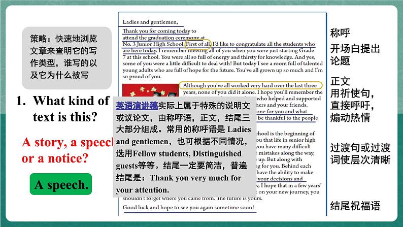 1. 掌握本课重点词汇及复习语言点,了解演讲稿的基本构成。2.通过励志教育激发学生学习热情,通过阅读活动,掌握根据图片预测文章内容,借助关键词分辨文章类型和写作原因,借助中心句及连接词分析篇章结构等策略;3.借助情感共鸣梳理文章,对文章进行复述;提升逻辑性思维。4.懂得珍视友情、珍惜剩下的中学生活,。让学生对于他们的未来有很好的规划,憧憬高中的生活,完成他们的理想目标。