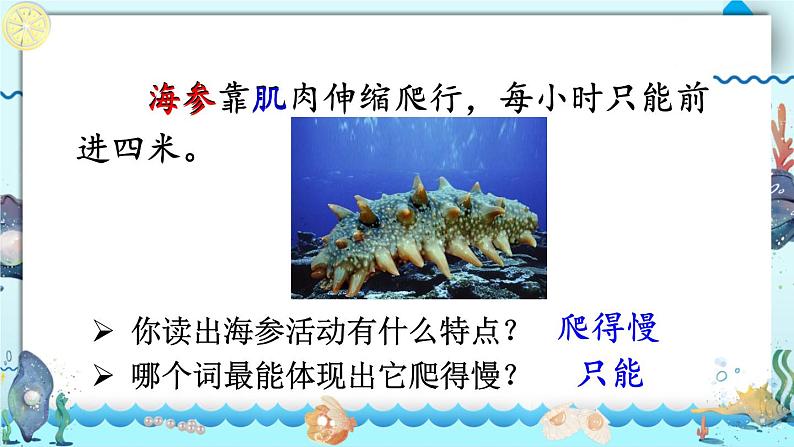 你读出海参活动有什么特点?哪个词最能体现出它爬得慢?