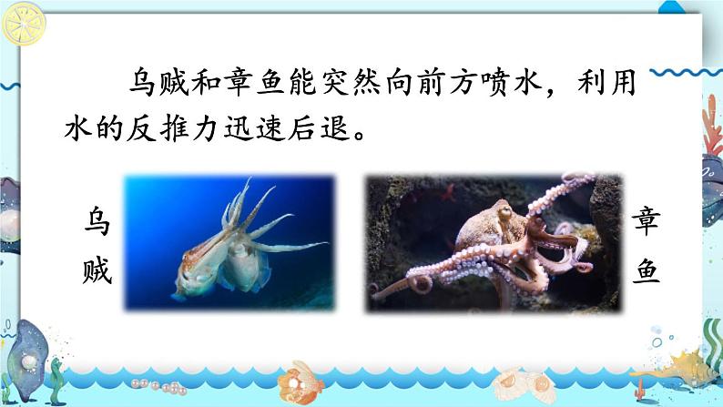 乌贼和章鱼能突然向前方喷水,利用水的反推力迅速后退。