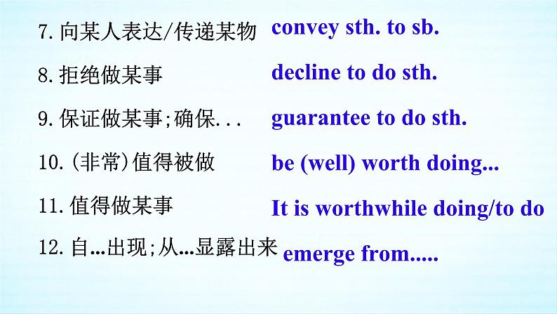 7.向某人表达/传递某物8.拒绝做某事9.保证做某事;确保(非常)值得被做11.值得做某事12.自...出现;从...显露出来