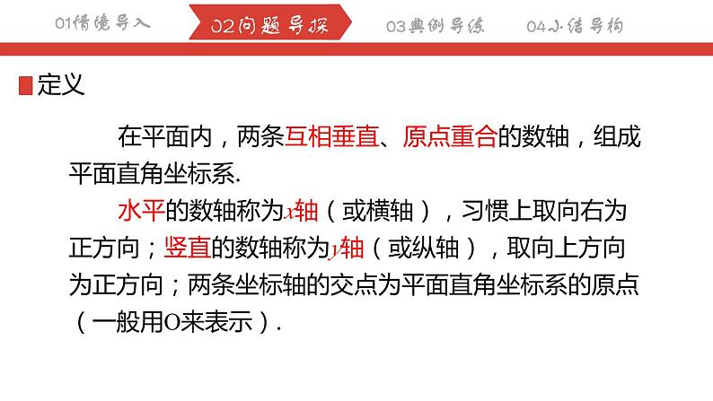 在平面内,两条互相垂直、原点重合的数轴,组成平面直角坐标系. 水平的数轴称为x轴(或横轴),习惯上取向右为正方向;竖直的数轴称为y轴(或纵轴),取向上方向为正方向;两条坐标轴的交点为平面直角坐标系的原点(一般用O来表示).
