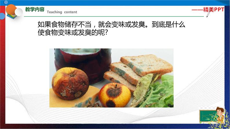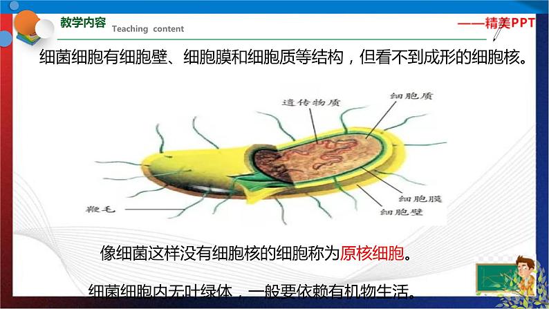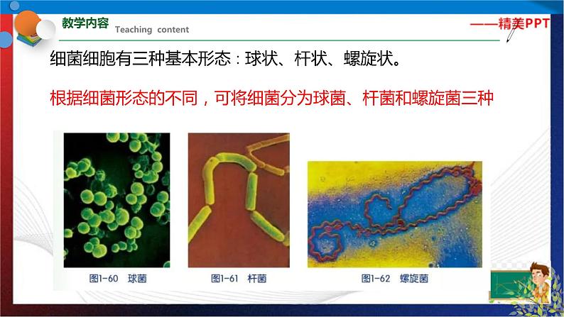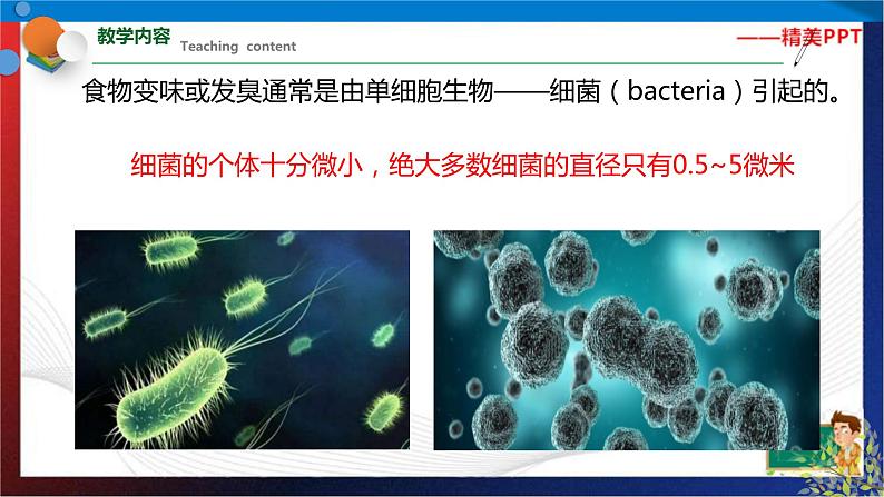 七年级《科学》下册同步备课(浙教版)1.6 细菌和真菌的繁殖主讲老师:xx老师如果食物储存不当,就会变味或发臭。到底是什么使食物变味或发臭的呢?食物变味或发臭通常是由单细胞生物——细菌(bacteria)引起的。细菌的个体十分微小,绝大多数细菌的直径只有0.5~5微米我们可以看到细菌大量繁殖后形成的细菌团,即菌落细菌细胞有三种基本形态∶球状、杆状、螺旋状。根据细菌形态的不同,可将细菌分为球菌、杆菌和螺旋菌三种像细菌这样没有细胞核的细胞称为原核细胞。细菌细胞内无叶绿体,一般要依赖有机物生活。细菌细胞有细胞壁、细胞膜和细胞质等结构,但看不到成形的细胞核。细菌是通过______进行繁殖的。细菌的这种生殖方式属于_____(填"有性"或"无性")生殖。细菌的分裂生殖示意图细菌分裂开始时,首先会复制它的遗传物质,然后细胞一分为二,两套一样的遗传物质随之平均分配到两个细胞中视频:细菌对人类既有益又有害。 有些食物不能用高温加热(如牛奶),否则会影响它们的营养价值和味道。 我们可快速将它们加热至一定温度(一般为60℃~85℃),持续一段时间,然后迅速冷却。这样既能杀死食物中的大部分微生物,又能保持原有食物的味道,这种加热法叫做巴氏消毒法。 巴斯德通过大量的实验和论证,有力地支持了细菌学说,创立了近代微生物学。 巴斯德还善于解决实际问题,其中以发明预防接种的方法最为闻名。他相继研究出针对狂犬病、炭疽病和鸡霍乱等疾病的预防接种方法,为人类有效预防疾病作出了杰出贡献。使面包发霉的是霉菌。真菌的细胞与植物、动物细胞一样都有细胞核,属于真核细胞。真菌种类繁多,已经记载的真菌约有10万种,如用于酿酒、制作面包的酵母菌,引起食物霉变的霉菌,可食用的蘑菇、香菇、金针菇等食用菌等。酵母菌是一类常见的单细胞真菌,在自然界中种类较多,分布很广,其细胞形态通常为圆形、卵圆形或椭圆形,比细菌的个体要大得多。酵母菌的细胞结构主要包括___、_____和___等,酵母菌的生殖方式主要是___。 酵母菌的出芽繁殖酵母菌与人类的关系十分密切,现在仍被广泛应用于发面和酿造酒、醋等。视频:1分钟了解酵母菌常见的霉菌有根霉、青霉和曲霉等。霉菌有着极强的繁殖能力,在自然界中,霉菌主要依靠菌丝的顶端产生孢子进行繁殖。视频:1分钟了解霉菌还有一些真菌可以食用,如香菇、蘑菇、金针菇、木耳等,人们称它们为食用菌。 凤尾菇,金针菇,香菇食用菌主要也是通过产生孢子的方式进行繁殖的。 蘑菇的孢子生殖食物的保存微生物几乎无处不在,为避免食物变质,必须设法防止或减慢微生物的生长。其主要方法有∶1,真空保存法;2,干藏法;3,冷藏法;4,腌制法1,真空保存法:抽出包装袋中的空气,使食物与空气隔绝2,干藏法∶去掉食物中的水分势醋大蒜咸肉3,冷藏法∶低温环境 腌制法∶用糖、盐、酱油、醋等腌制食品1.世界上最大的细菌被称之为纳米比亚的硫磺珍珠,呈球形,人类用肉眼就可以看清楚。下列有关这种球菌的叙述正确的是( )A.有叶绿体 B.属于多细胞生物体