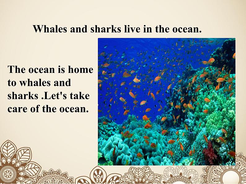 The cean is hme t whales and sharks .Let's take care f the cean.